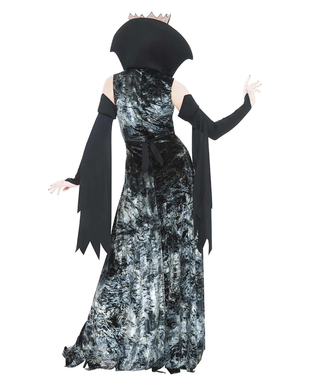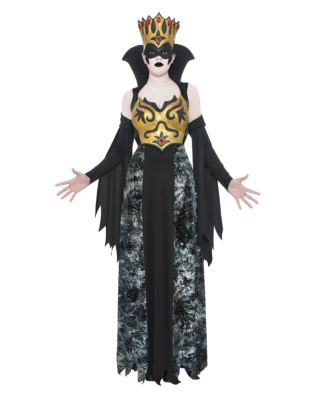 Das Dämonen Königin Kostüm besteht aus einem Kleid, separaten Ärmeln, einem Latex Brustpanzer und einer Latex-Krone mit integrierter Maske. Das Kleid geht bis zum Boden und besteht aus grau marmoriertem Stoff. Eine Bahn schwarzer Stoff geht vorn vom Hals bis zum Saum. Am Hals hinten hat das Kleid einen schwarzen hohen Stehkragen aus Schaumstoff. Der Brustpanzer aus Latex, der einen gold-bronzenen Farbton hat, wird über dem Kleid getragen . Schwarze Ornamente und ein roter Schmuckstein sind seine Verzierungen. Die Krone hat eine schwarze Augenmaske angehängt, darüber ist sie wie der Brustpanzer golden mit roten Schmucksteinen und schwarzen Ornamenten. Die separaten Ärmel beginnen an der Mitte des Oberarms und gehen bis zum Handgelenk. Schwarze gezackte Stoffbahnen hängen von Ärmeln herab. Das Kostüm wird mit Nagellack und Lippenstift schwarz, den Schwarze Fingernägel mit Totenschädelmotiv und der Totenkopf Halskette messingfarben richtig gespenstisch.