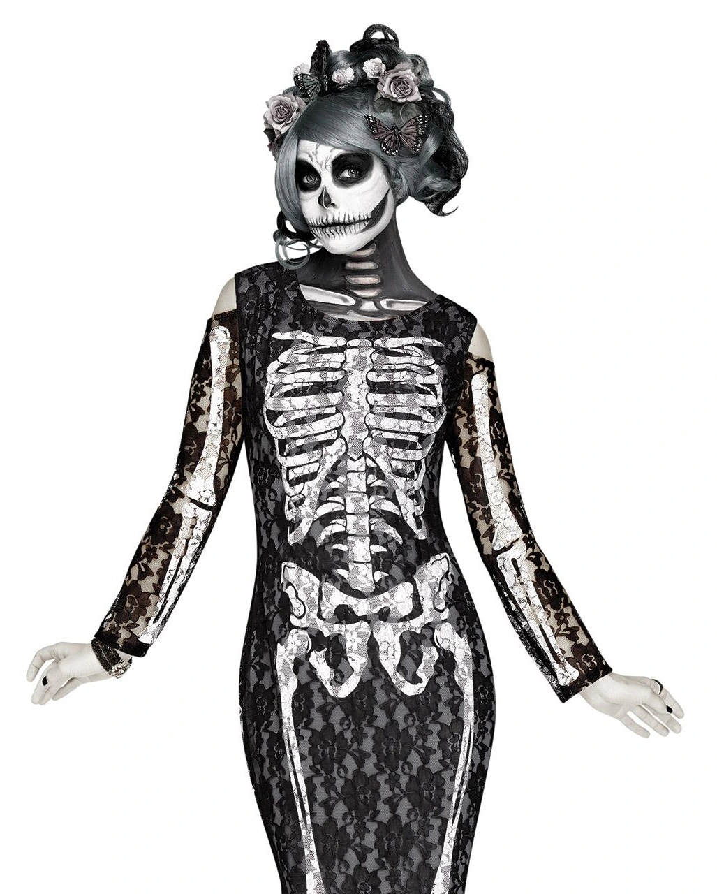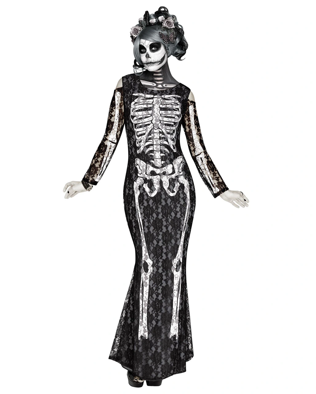 Beim Tanz der Hexen und Monster wirst du das schönste aller Skelette sein. Ein Elegantes Spitzen Skelett Kleid verleiht dir eine schaurig-schöne Note und macht dich zum sexy Vamp! Das Halloween Damenkostüm ist ein figurbetontes Spitzenkleid mit großem Skelett-Print und passt hervorragend zu Grusel-Partys oder Tag der Toten-Events. Das Spitzen Skelett Kostüm kann mit Perücken und Accesoires aus unserem Sortiment kombiniert werden.