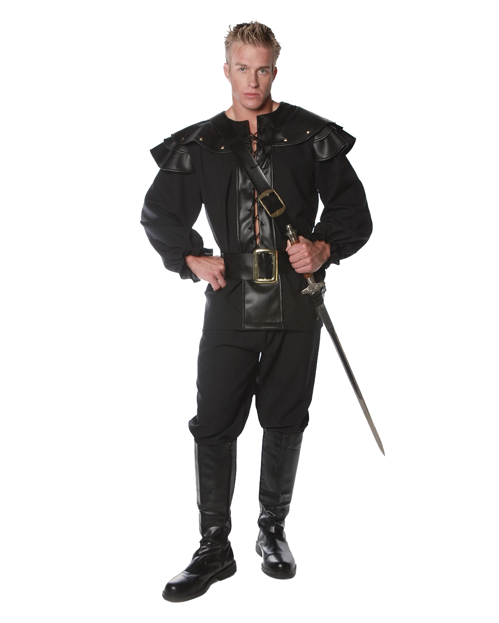 Das schön gearbeitete, schwarze Seeräuber Kostüm eines Captain Morgain Piraten Hut Deluxe besteht aus schwarzer Hose mit Gummizug, schwarzem Hemd mit Kunstlederapplikation im Brustbereich, Kragen und Schultern, einem Kunstledergürtel und -Schultergurt für die Silbernes Dämonen Ritterschwert. Das Hemd hat eine Schnürung die dem Defender Kostüm einen verwegenen Piraten-Look verpasst.