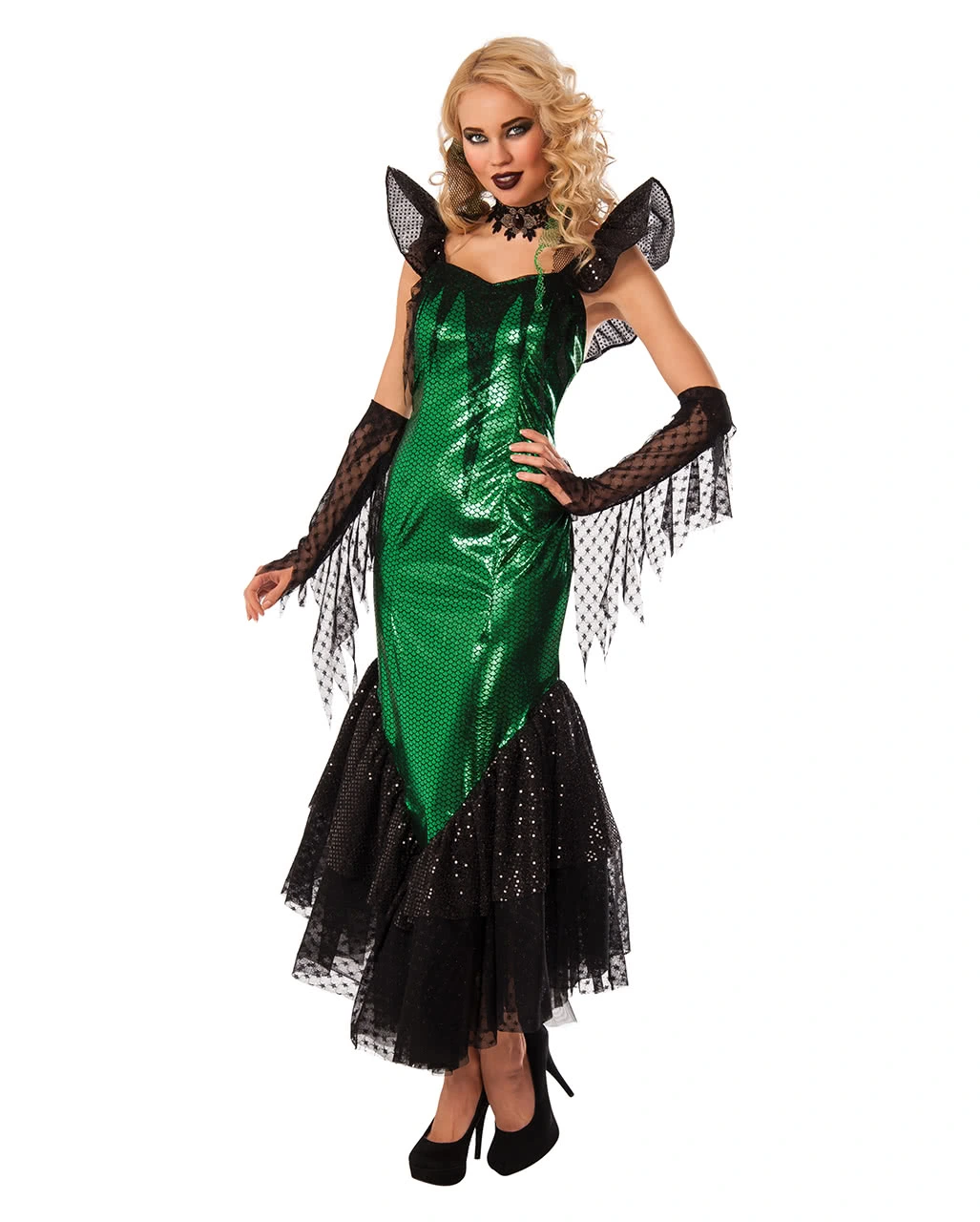 Das Gothic Kostüm Meerjungfrau besteht aus einem knöchellangen Kleid, zwei Handschuhen, einem Kropfband und einer Haarklammer. Das Kleid des Märchen-Kostüms ist in einem dunklen Grünton gehalten mit zahlreichen stilisierten Schuppen. Der schwarze Tüll am unteren Ende des Nymphen-Kleides ist so geschickt angeordnet, dass der typische Schwanzflossen-Look entsteht. Mit zwei seitlich angenähten Bändern kannst du dein Sirenen-Kleid noch taillierter schnüren. Feine, spitzenbesetzte lange Handschuhe mit abstehenden Elementen wie bei Fischflossen unterstützen den geheimnisvollen Meeresbewohner-Anblick zusätzlich. Das schwarze Kropfband weist vorne eine silberne Blume mit Rubin als Blüte auf und wird mittels Karabiner im Nacken geschlossen. Abgerundet wird die sexy Faschings-Verkleidung durch den Haarschmuck, schwarzen und grünen Bändern in Netzoptik, die mittels Klammer unkompliziert ins Haar gesteckt werden. Zahlreiche glänzende Pailletten schmücken das Nixen-Kostüm und erwecken den Eindruck von vielen kleinen Wassertropfen. Dazu passen die Siren Langhaar Perücke schwarz und Schwarzer Nagellack & Lippenstift.