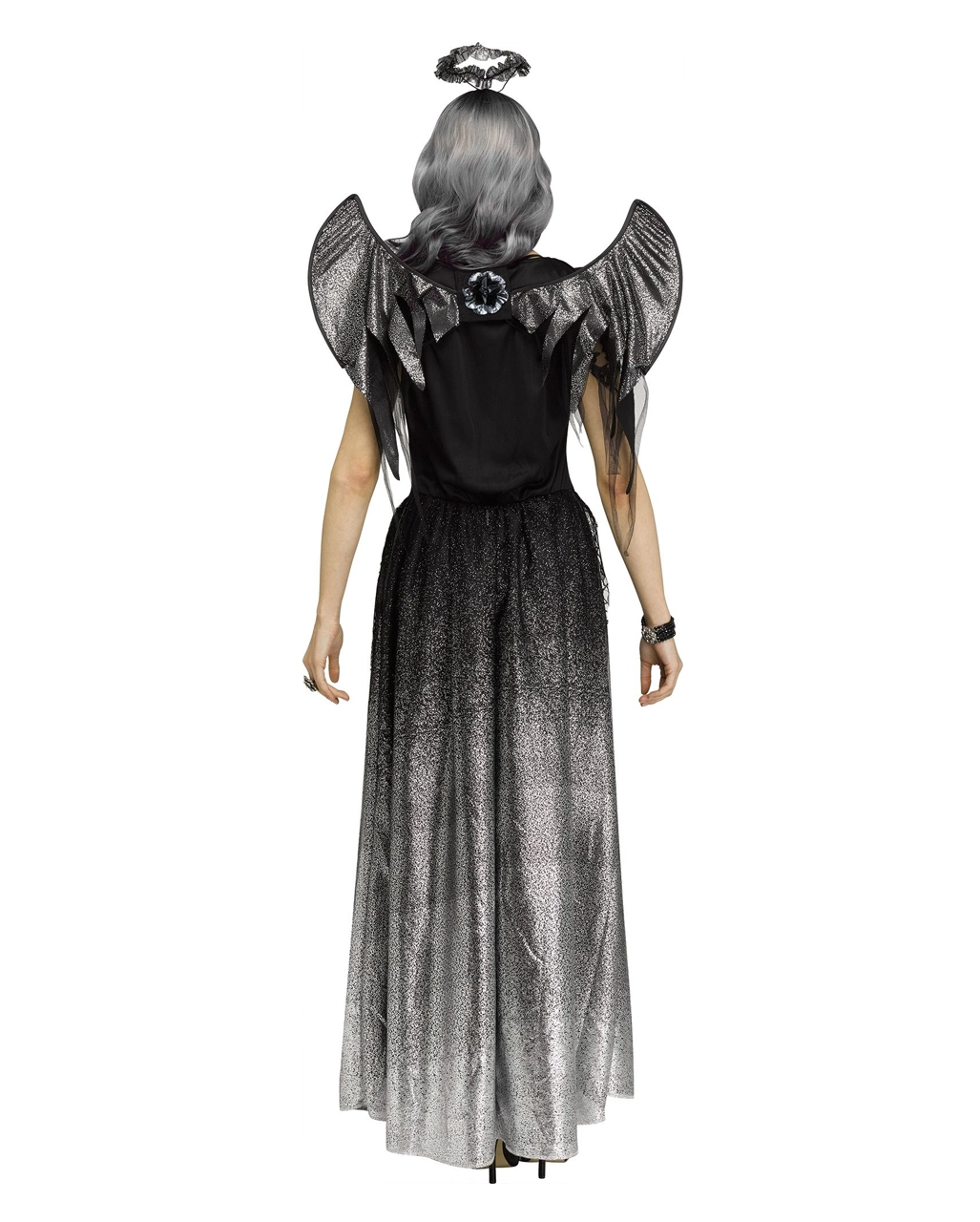 Ob Todesengel Verkleidung oder liebliches Halloweenkostüm der besonderen Art, unser schwarz-silbernes Engel Kostüm für Frauen ist wie geschaffen für deine dunkle Seele. Das wunderschöne Kostümkleid zaubert durch sein Dreieck aus silbernem Glitzerstoff eine besonders hübsche Taille. Das lange fließende Kleid sorgt durch seine Übergänge von Schwarz ins Silbergraue für eine elegant-düstere Erscheinung. Die schwarzen Flügel und der silberne Heiligenschein komplettieren das Kostüm-Set des dunklen Engels.