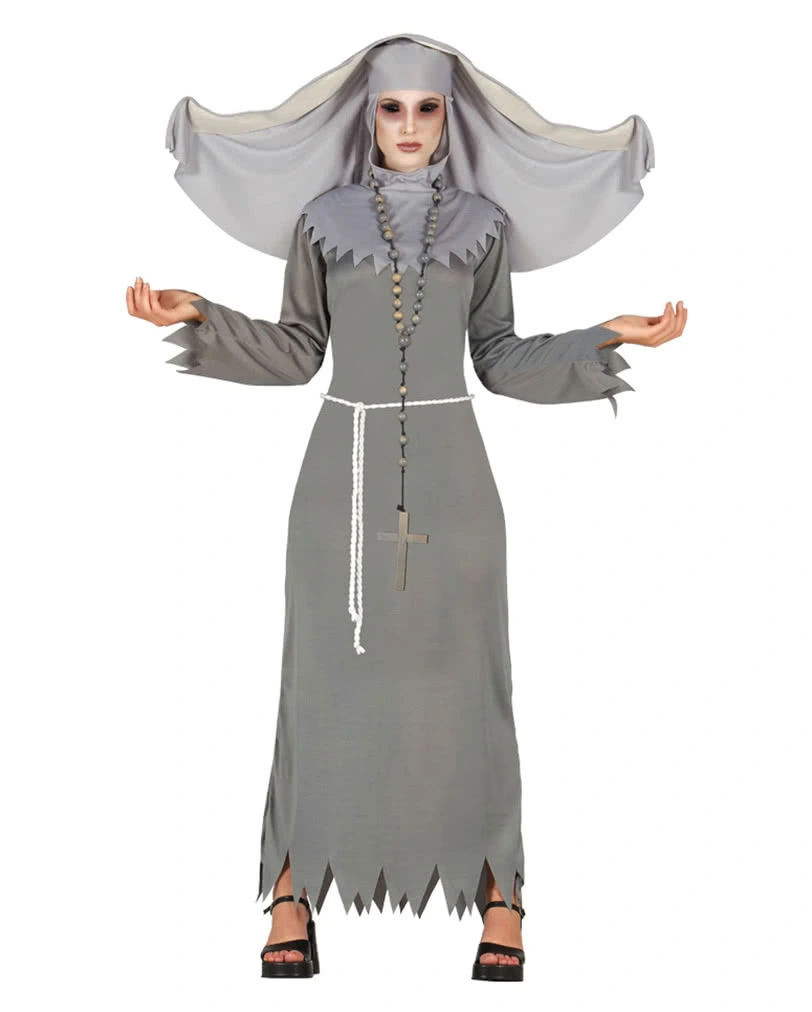 Das Zombie Klosterfrau bestehend aus einer grauen Kutte mit angenähter Haube, Kapuze und Gürtel verwandelt dich in die besessene Nonne. Die graue Kutte schließt an Ärmeln, Rockende Kapuzenende zackenförmig ab. Die Haube ist zweiteilig und kann durch einen biegsamen Einsatz beliebig in Form gebracht werden. Darunter wird die in etwas hellerem Grauton gehaltene Kapuze getragen, an der die Haube durch Klettverschluss befestig wird. Zum Abschluss der Ordenstracht wird der graue Gürtel um die Taille gebunden. Um deinen Auftritt als selbst etwas besessene Nonne zu vervollständigen empfehlen wir dir den [Rosenkranz mit Kreuz und das 4-tlg.Schwarz-Weiß Make Up Set.